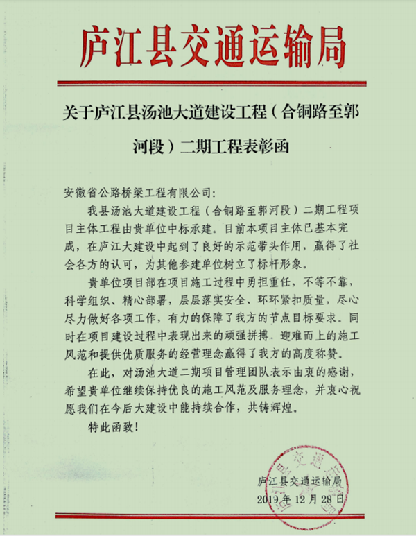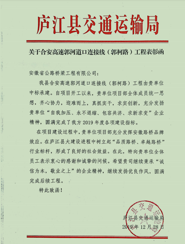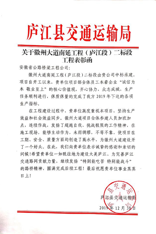 近日,公司收到廬江縣交通運輸局寄來的表揚信,對徽州大道南延工程(廬江段)二標(biāo)段、湯池大道建設(shè)工程(合銅路至郭河段)二期及合安高速郭河道口連接線(郭柯路)工程等三個項目積極克服各類困難,高標(biāo)準(zhǔn)、嚴要求推進施工生產(chǎn)給予表揚和感謝。