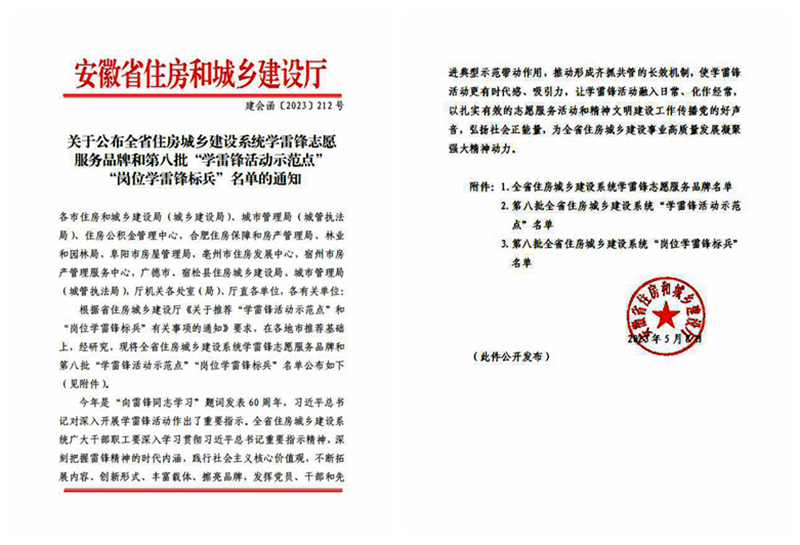 近日,安徽省住房和城鄉(xiāng)建設廳公布了第八批全省住房城鄉(xiāng)建設系統(tǒng)“崗位學雷鋒標兵”名單,表彰一批樂于奉獻、自覺踐行雷鋒精神的崗位標兵。公司職工石懷遠、趙玉珠獲此殊榮。