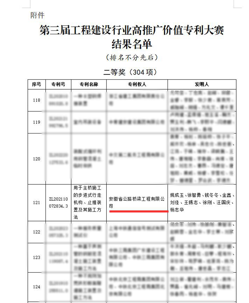 近日,中國施工企業(yè)管理協(xié)會“第三屆工程建設(shè)行業(yè)高推廣價(jià)值專利大賽決賽”評選結(jié)果揭曉。由公司報(bào)送的《用于主橋施工的步進(jìn)式行走機(jī)構(gòu)、止推裝置及其施工方法》實(shí)用新型專利,在全國2498個(gè)參賽項(xiàng)目、19個(gè)復(fù)賽項(xiàng)目中脫穎而出,榮獲二等獎(jiǎng),實(shí)現(xiàn)了公司在該類別獎(jiǎng)項(xiàng)的新突破。