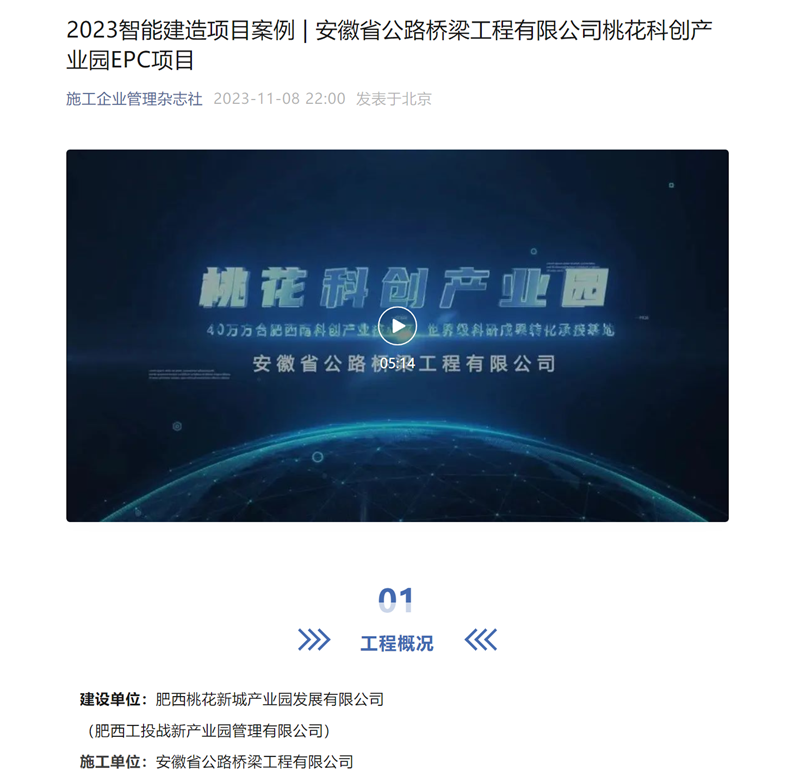近日,從施工企業(yè)管理雜志社傳來(lái)喜訊,桃花科創(chuàng)產(chǎn)業(yè)園項(xiàng)目入選施工企業(yè)管理雜志社2023智能建造項(xiàng)目案例,同步對(duì)案例進(jìn)行了專(zhuān)題介紹。