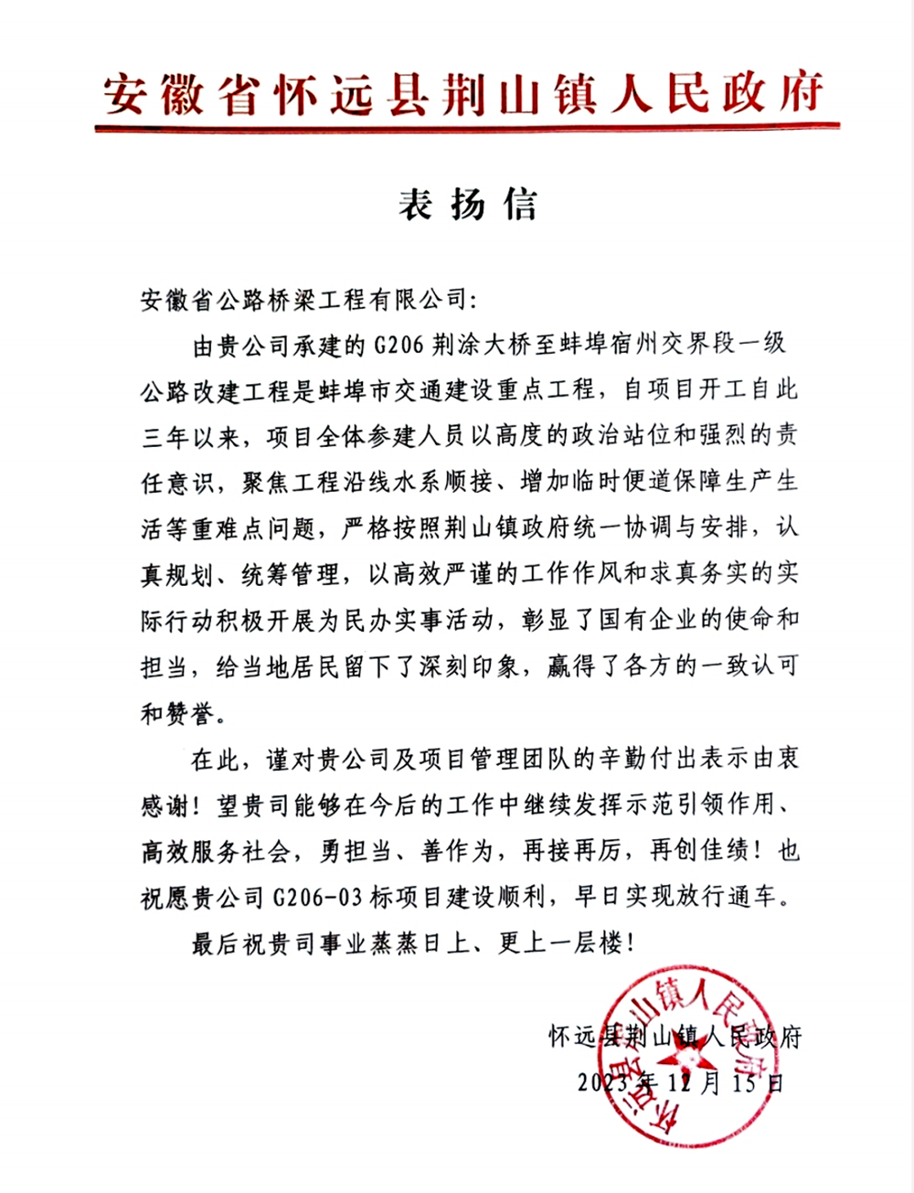 懷遠(yuǎn)縣荊山鎮(zhèn)人民政府來信表示,G206荊涂大橋蚌埠至宿州交界段一級(jí)公路改建工程03標(biāo)項(xiàng)目全體參建人員積極與政府協(xié)調(diào)配合,推動(dòng)項(xiàng)目高質(zhì)量建設(shè),以實(shí)際行動(dòng)積極開展為群眾辦實(shí)事活動(dòng),踐行了國(guó)企擔(dān)當(dāng)。