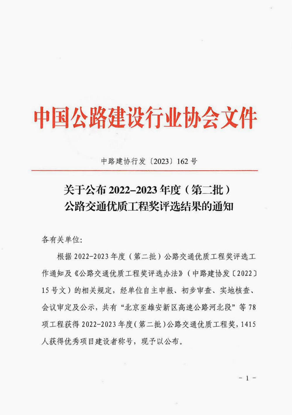 公路交通優(yōu)質(zhì)工程獎(李春獎)主要圍繞建設(shè)管理理念、工程建設(shè)質(zhì)量、科技創(chuàng)新成果等方面進行選拔,是全國公路交通行業(yè)最高質(zhì)量獎,也是公路建設(shè)者的最高榮譽。