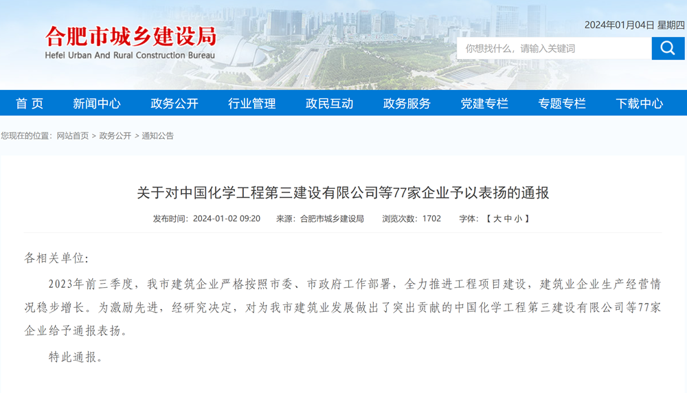公司獲合肥市城鄉(xiāng)建設(shè)局通報(bào)表?yè)P(yáng)