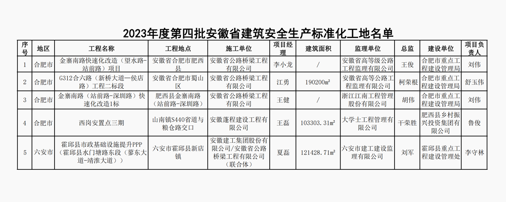 近日,安徽省建設(shè)工程質(zhì)量與安全協(xié)會公布2023年度第四批安徽省建筑安全生產(chǎn)標(biāo)準(zhǔn)化工地名單,由公司承建的金寨南路快速化改造(望水路-站前路)項目、G312合六路(新橋大道-侯店路)工程二標(biāo)段、金寨南路(站前路-深圳路)快速化改造1標(biāo)、霍邱縣市政基礎(chǔ)設(shè)施提升PPP(霍邱縣水門塘路東段(蓼東大道-靖淮大道))、肥西文旅西崗安置點三期等5個項目光榮上榜。