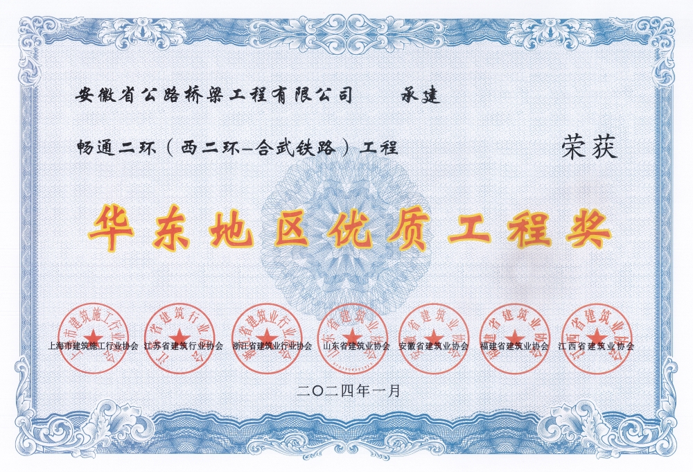 近日,由公司承建的暢通二環(huán)(西二環(huán)-合武鐵路)工程獲得華東地區(qū)優(yōu)質(zhì)工程獎,至此,公司已奪得7項華東地區(qū)優(yōu)質(zhì)工程獎。