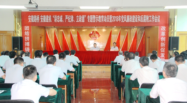 6月13日,公司在七樓會議室召開“講忠誠、嚴紀律、立政德”專題警示教育動員暨2018年度黨風廉政建設和反腐敗工作會議。公司領導班子成員、中層干部和安徽建機中層以上干部參加會議,公司黨委書記、董事長、總經理孫學軍出席會議并作動員講話,會議由公司黨委委員、紀委書記林緒坤主持,