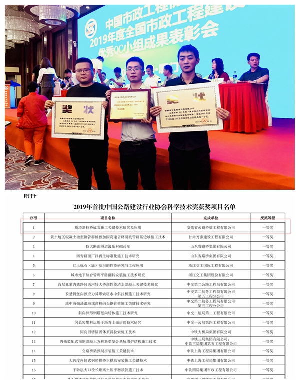 近日,從中國公路建設(shè)行業(yè)協(xié)會、中國市政協(xié)會獲悉,由市政分公司申報的《矮塔斜拉橋成套施工關(guān)鍵技術(shù)研究及應(yīng)用》項目榮獲2019年首批中國公路建設(shè)行業(yè)協(xié)會科學(xué)技術(shù)獎一等獎;市政分公司QC攻關(guān)小組成果分別摘得一等獎2項、二等獎3項、三等獎2項,公司再次榮獲“全國市政工程建設(shè)QC小組活動優(yōu)秀企業(yè)”榮譽(yù)稱號。