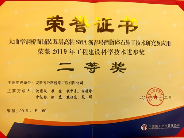 近日,2019年中國(guó)施工企業(yè)管理協(xié)會(huì)工程建設(shè)科學(xué)技術(shù)獎(jiǎng)勵(lì)大會(huì)在天津召開,公司主持的課題成果“大曲率鋼橋面鋪裝雙層高粘SMA瀝青瑪蹄脂碎石施工技術(shù)”經(jīng)過專家評(píng)審,榮獲二等獎(jiǎng)。