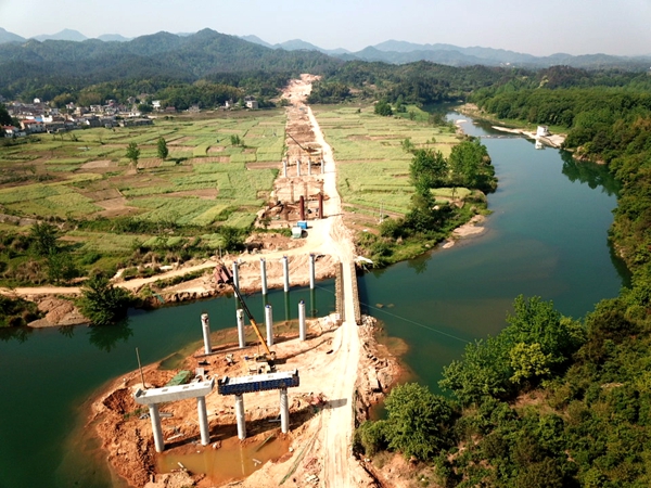 3月25日復興橋下部結構基礎完成,3月31日蓮花山隧道右線削竹式洞門施工完畢,4月4日梁場首片梁板完成澆筑,4月5日路基一隊與二隊清表完成、便道實現(xiàn)貫通,全線路基、隧道、橋梁工程多點發(fā)力,工程建設穩(wěn)步推進。期間,受降雨影響,白洋河橋圩區(qū)遭到破壞,項目黨支部迅速成立應急施工小組,全天駐點搶抓工期,目前白洋河水中墩已全部澆筑完畢,鋼便橋也已經完成鋪設,如期完成既定任務,減輕了雨季到來前的施工壓力。