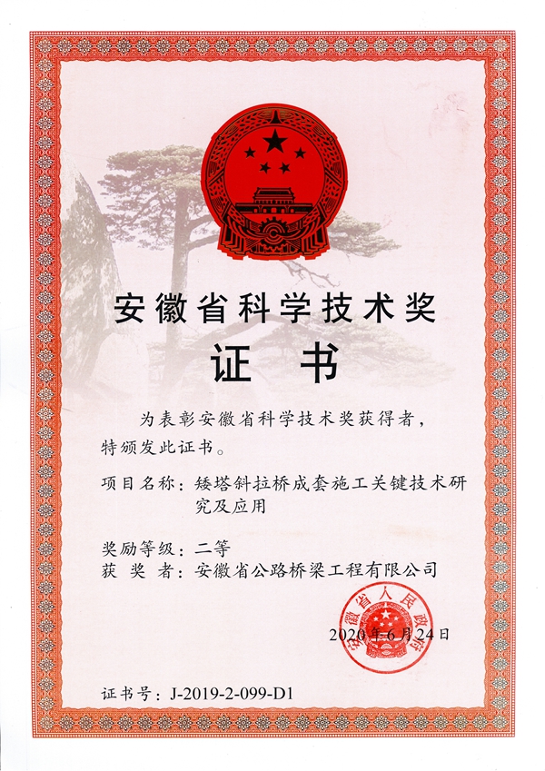 近期,公司主持申報(bào)的《矮塔斜拉橋成套施工關(guān)鍵技術(shù)研究及應(yīng)用》課題,通過(guò)層層篩選,榮獲“2019年度安徽省科學(xué)技術(shù)獎(jiǎng)二等獎(jiǎng)”。