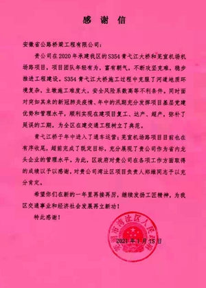 1月15日,蕪湖市灣沚區(qū)人民政府向安徽路橋公司發(fā)來感謝信,對公司順利完成青弋江橋和蕪宣機場路項目施工任務予以感謝。