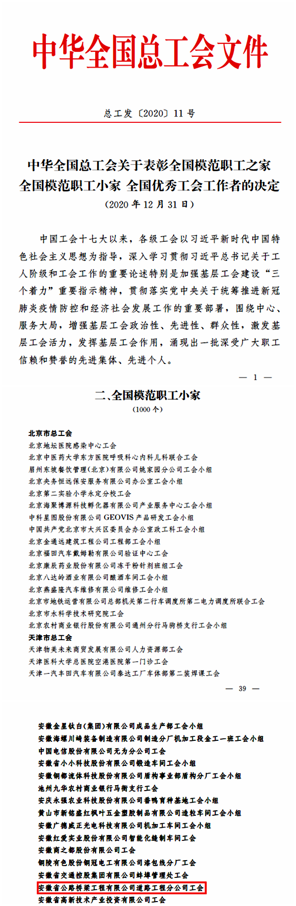 道路分公司榮獲“全國模范職工小家”榮譽稱號