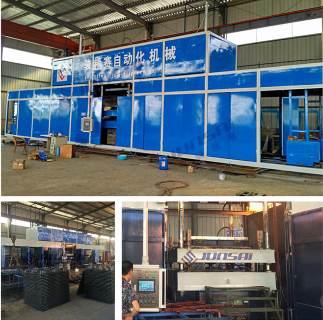 全自動厚片吸塑機(jī) 雙層棧板吸塑機(jī)的工藝過程如下:一,兩片塑料片材被放入機(jī)器內(nèi),然后壓緊進(jìn)行加熱;二,加熱到需要的成型溫度后,加熱裝置縮回,模具靠攏片材,同時開啟真空系統(tǒng),進(jìn)行吸塑成型;三,成型塑件在模具內(nèi)冷卻定型;第四步,移出定型好的塑件,然后用CNC進(jìn)行修邊、鉆孔。